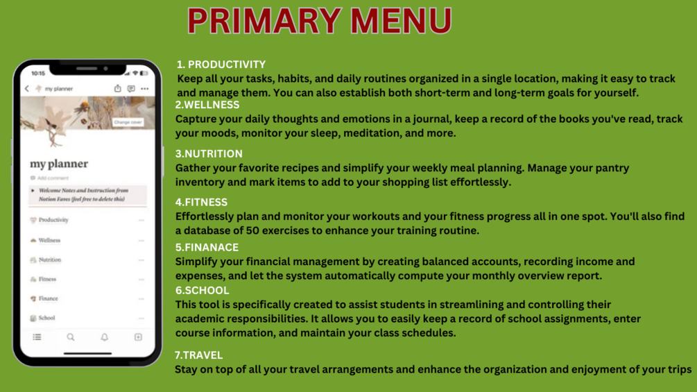 Embark on a journey of holistic empowerment with our All-in-One Life Planner Notion Template in the refreshing shade of Matcha Green. This comprehensive template is your passport to redefining productivity, wellness, nutrition, fitness, finance, education, and travel planningโall within the soothing embrace of a single Matcha-inspired digital haven.